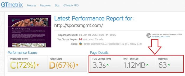 GTmetrix Test: The site scores relatively low with 3.3 seconds for 1.12MB of page speed load time. Yes, this can be impacted by coding, themes and other issues, but hosting and images are the biggest things that can impact speed scores. Typically a decent speed is about 1 second per MB of data, which we talk about in our WordPress theme Guide for 2017. The GTmetrix test here is not great, but also not horrible when you consider cost. Keep in mind that some of GTmetrix’s test servers are in Canada and distance from server can make a difference in speed.