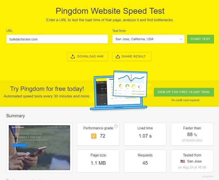 Tools.pingdom.com Test: The Pingdom test responded far better. It could have something to do with the server locations of where the data is hosted. Pingdom fetched the page in 802ms, which is under 1 second for the same 1.9MB of data. This test was run (as all the others) out of the San Jose test server, so it’s possible that the DreamHost data facility is closer to the Pingdom servers than GTMetrix.